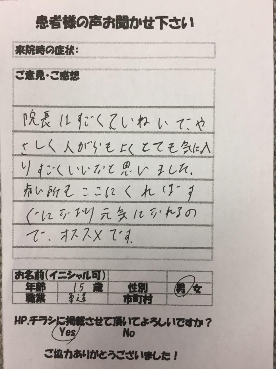 痛いところもすぐ治り元気になれます 2018.02.14 院長はすごくていねいで、やさしく人がらもよく、とても気に入りすごくいいなと思いました。 痛い所もここにくればすぐになおり元気になれるので、オススメです。 15歳:男:学生